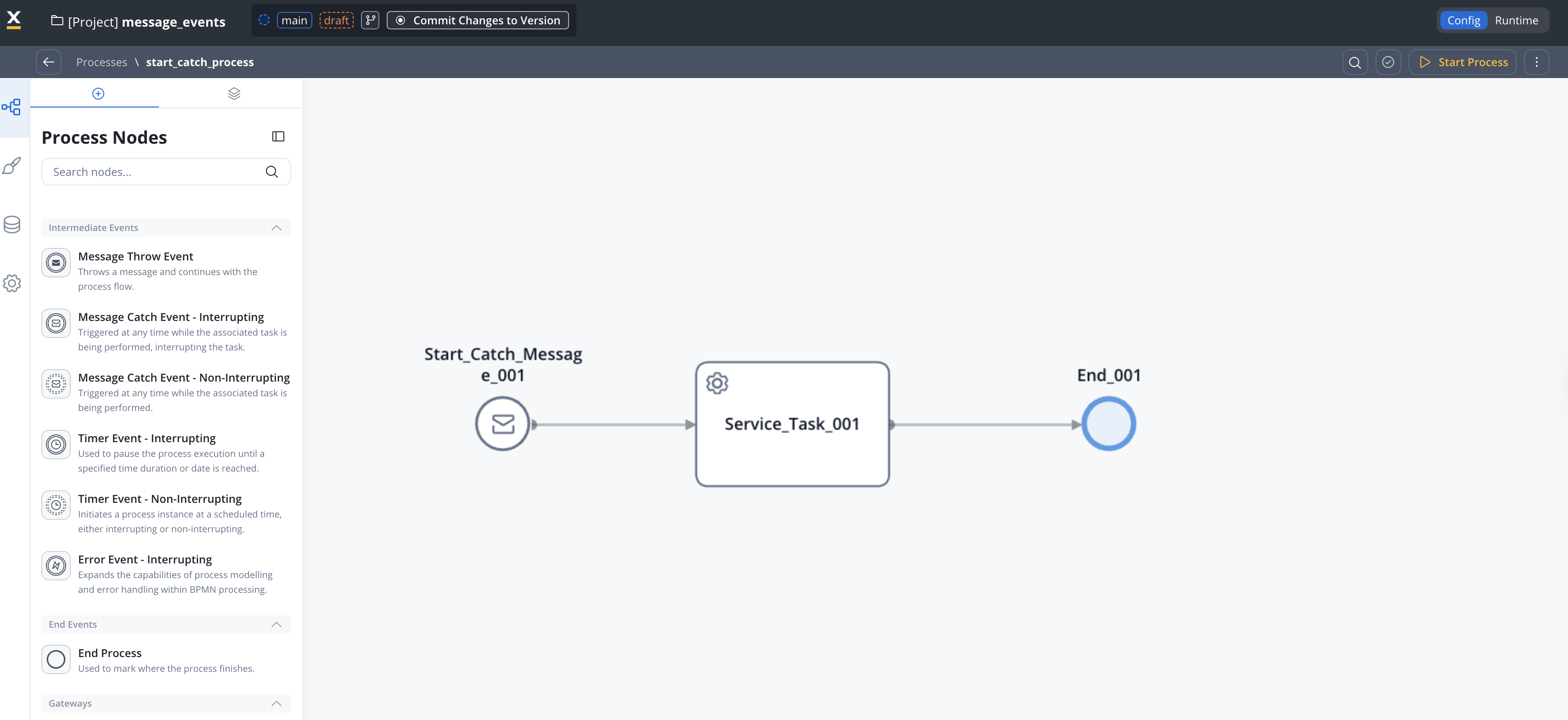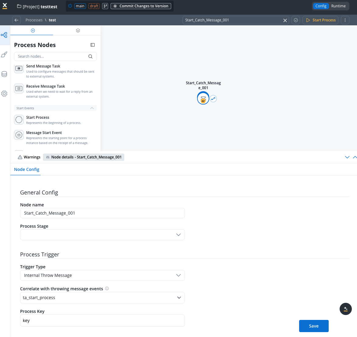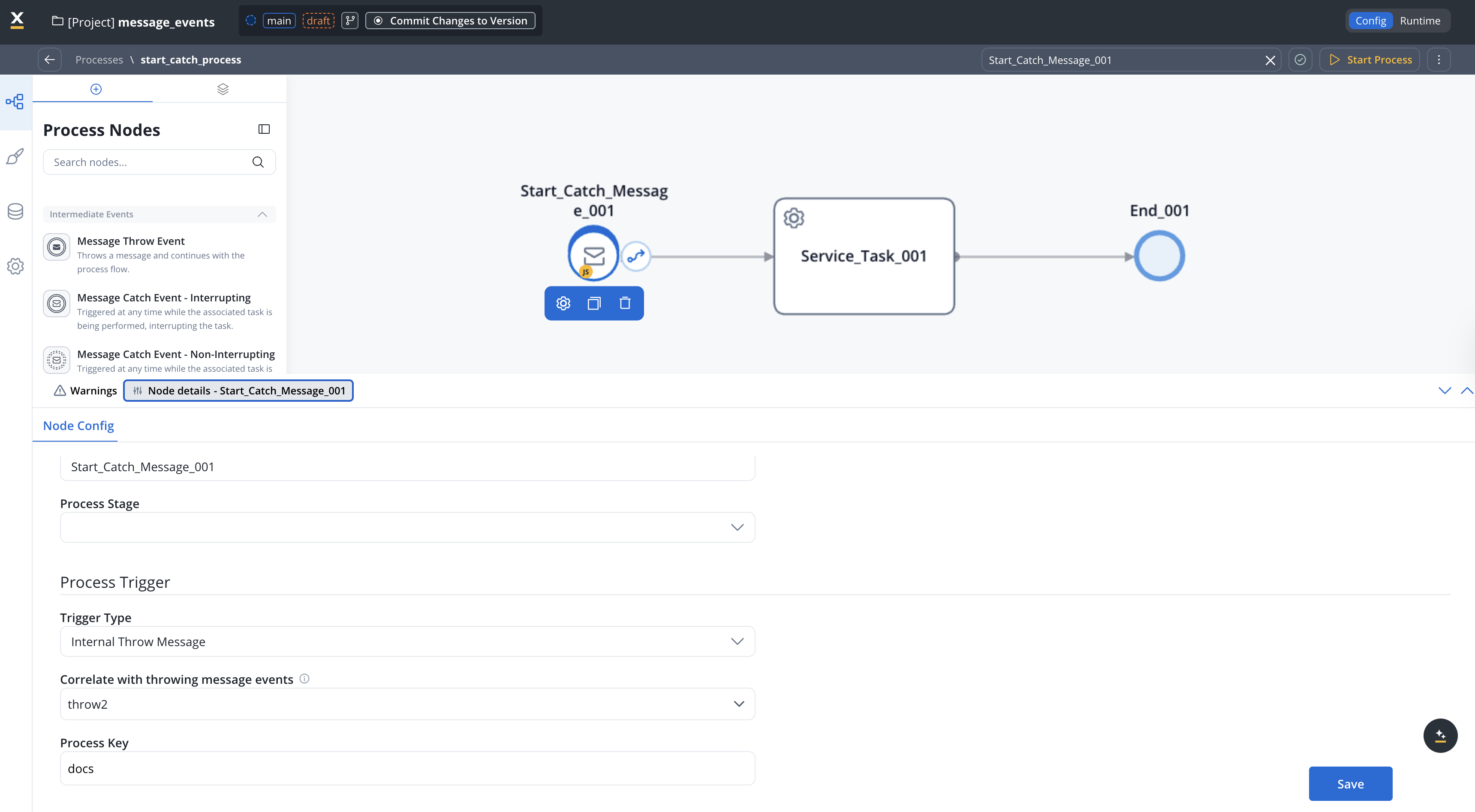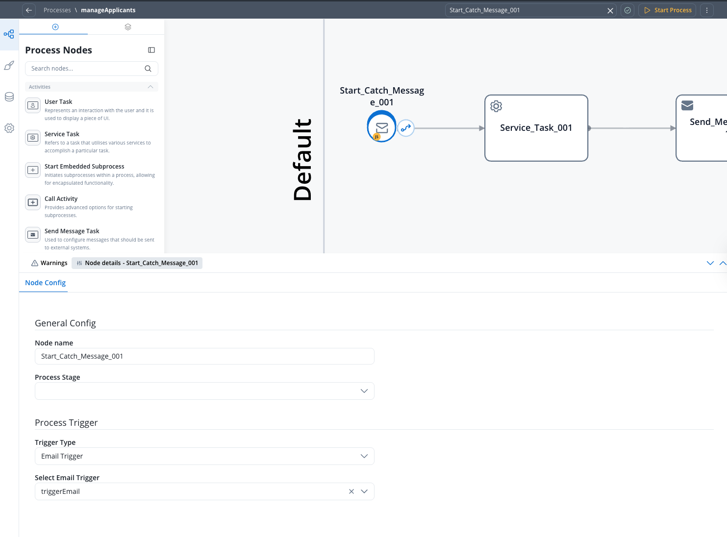 Configuring the Message Start Event (Start Catch Message) node