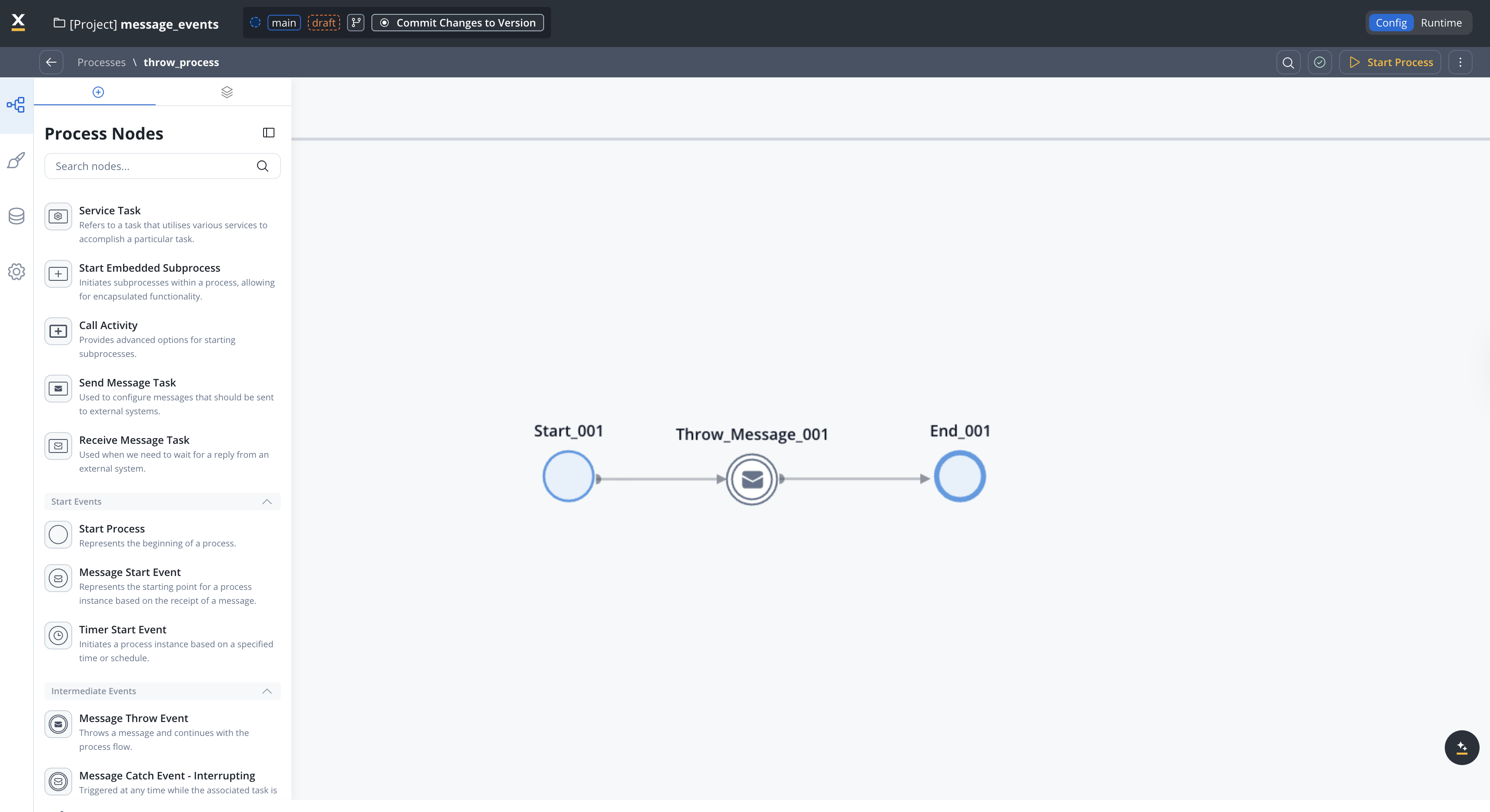 The catching process uses a Message Start Event configured with the Internal Throw Message trigger type.
