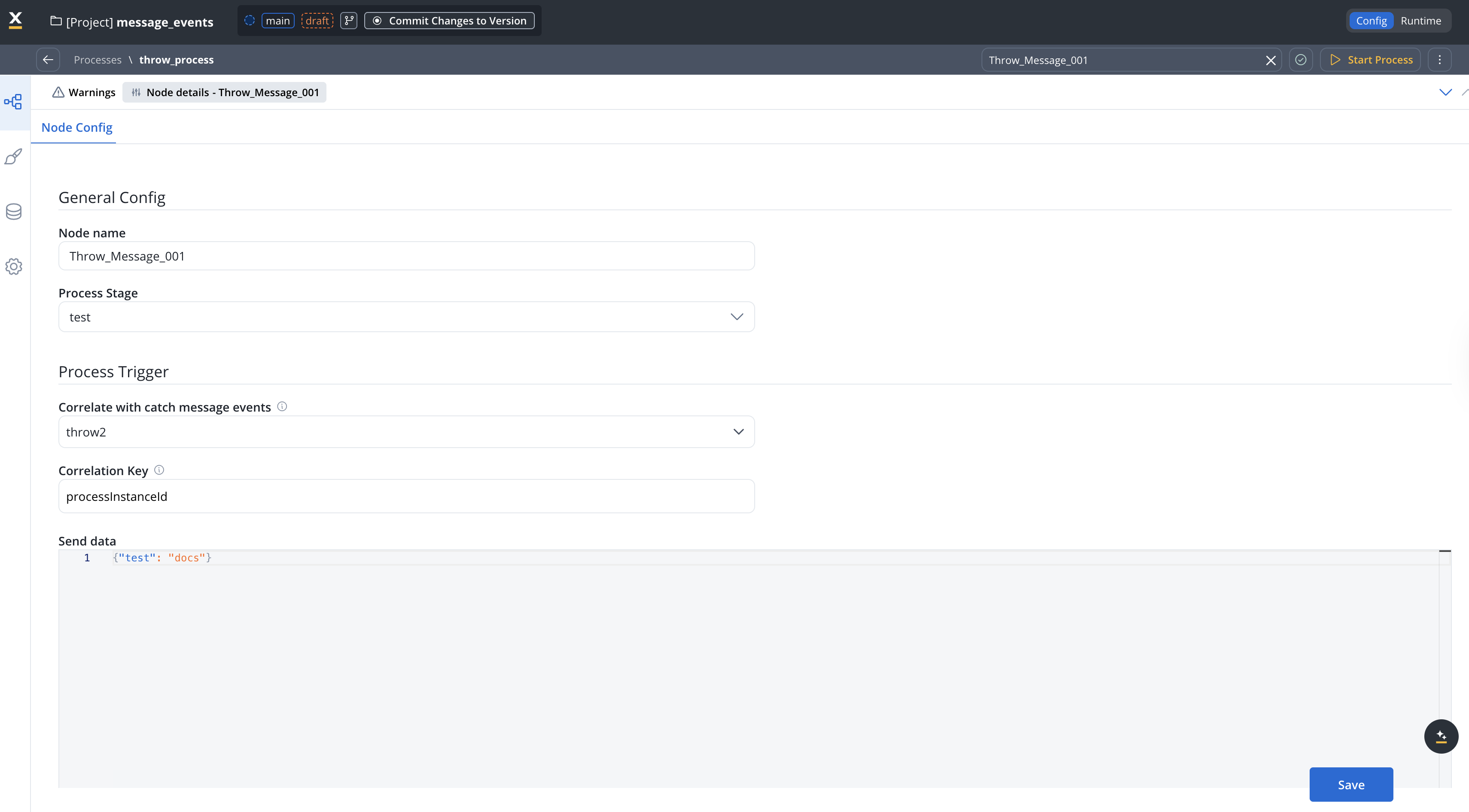 Select Internal Throw Message to enable message-based triggering from other processes.