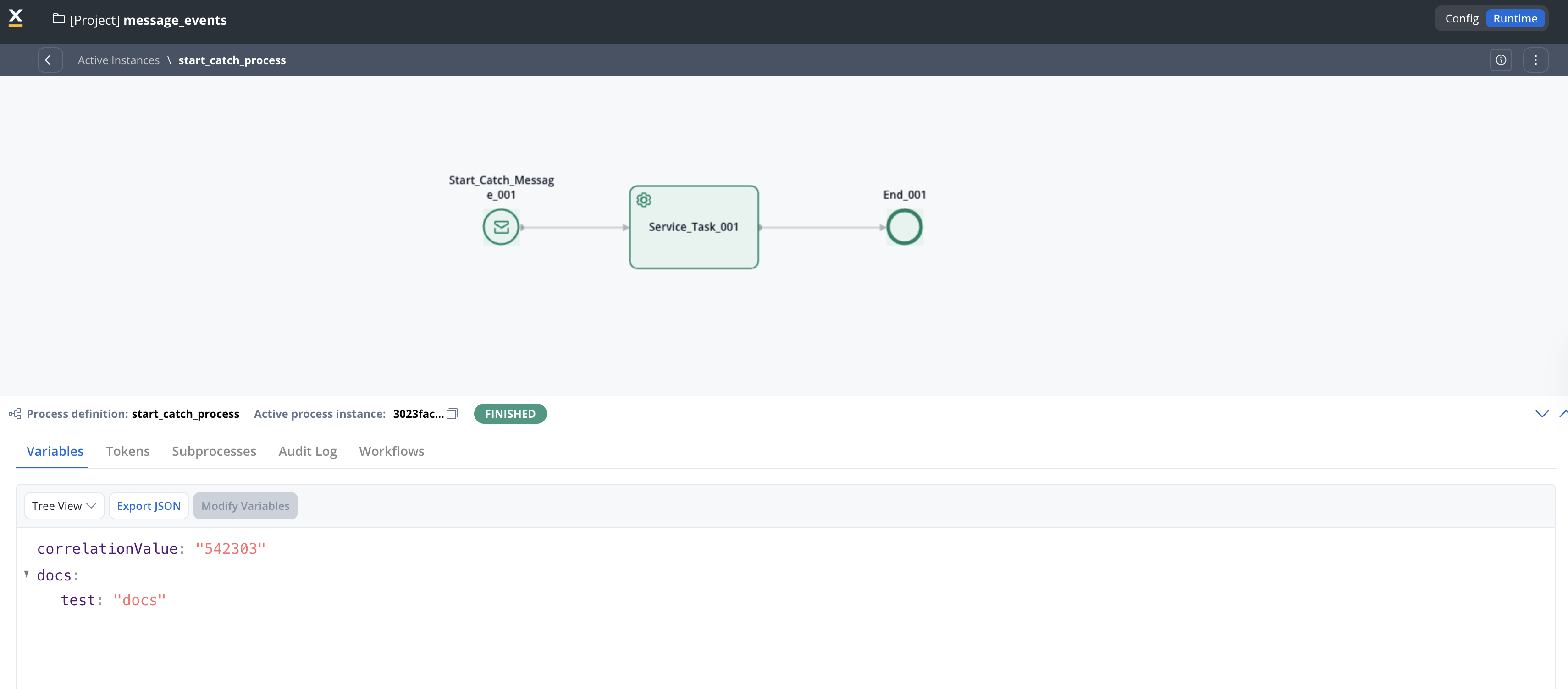 After running the throw process, the process containing the Message Start Event (Start Catch Message) node is triggered automatically. The data sent from the throwing process is available in the new process instance: