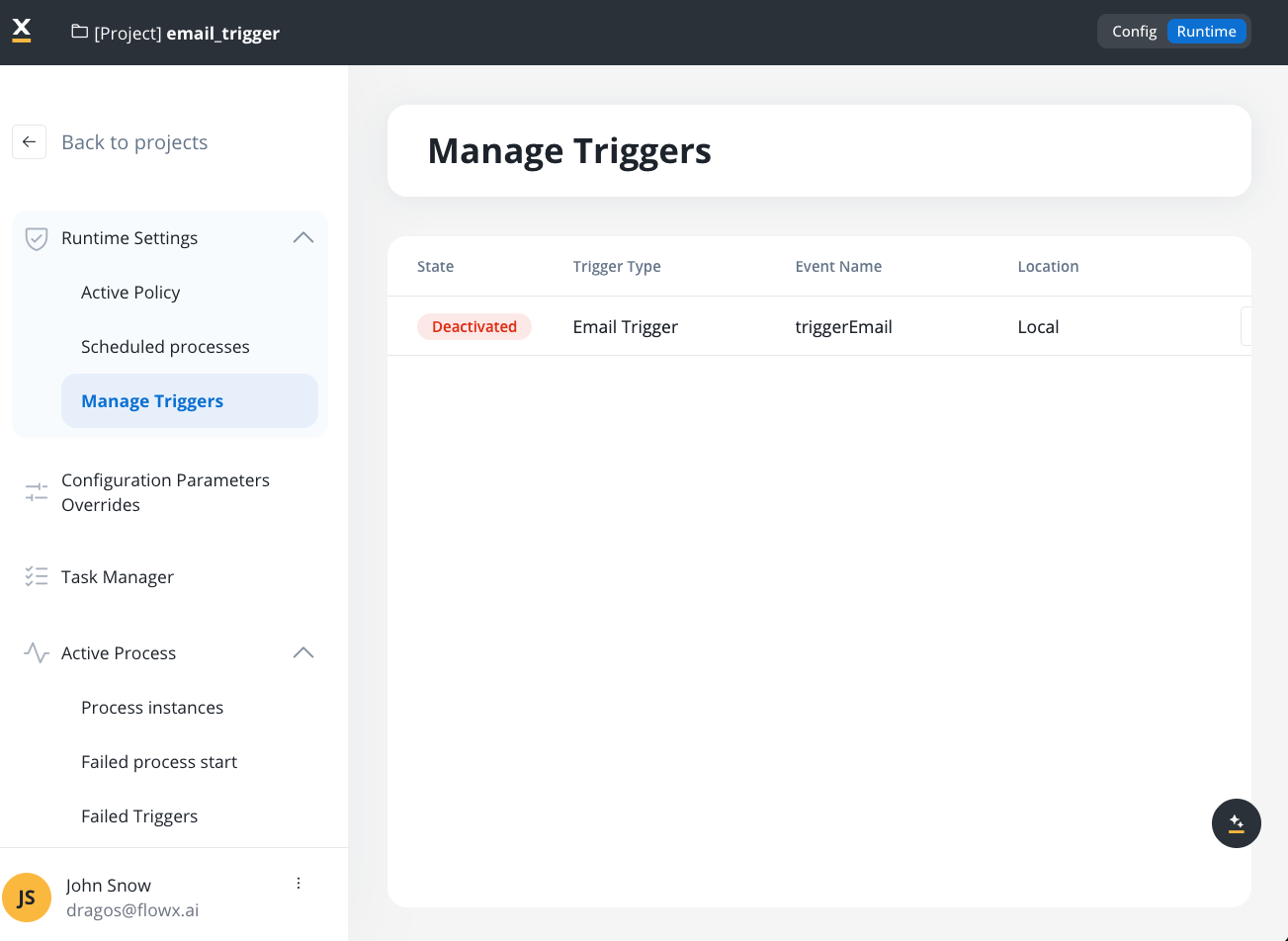 The Manage Triggers feature provides a centralized interface for monitoring and controlling event-based triggers that automatically start process instances. Triggers connect external events (such as email arrivals, message events, or other data sources) to your process definitions, enabling event-driven automation.Trigger Types