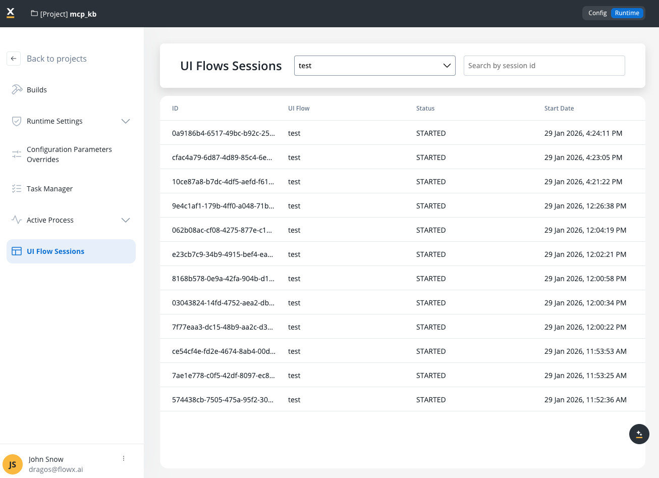 The UI Flow Sessions interface displays all active and historical sessions for UI Flows in your project. Each session appears as a row in the table with the following information:| Column | Description |