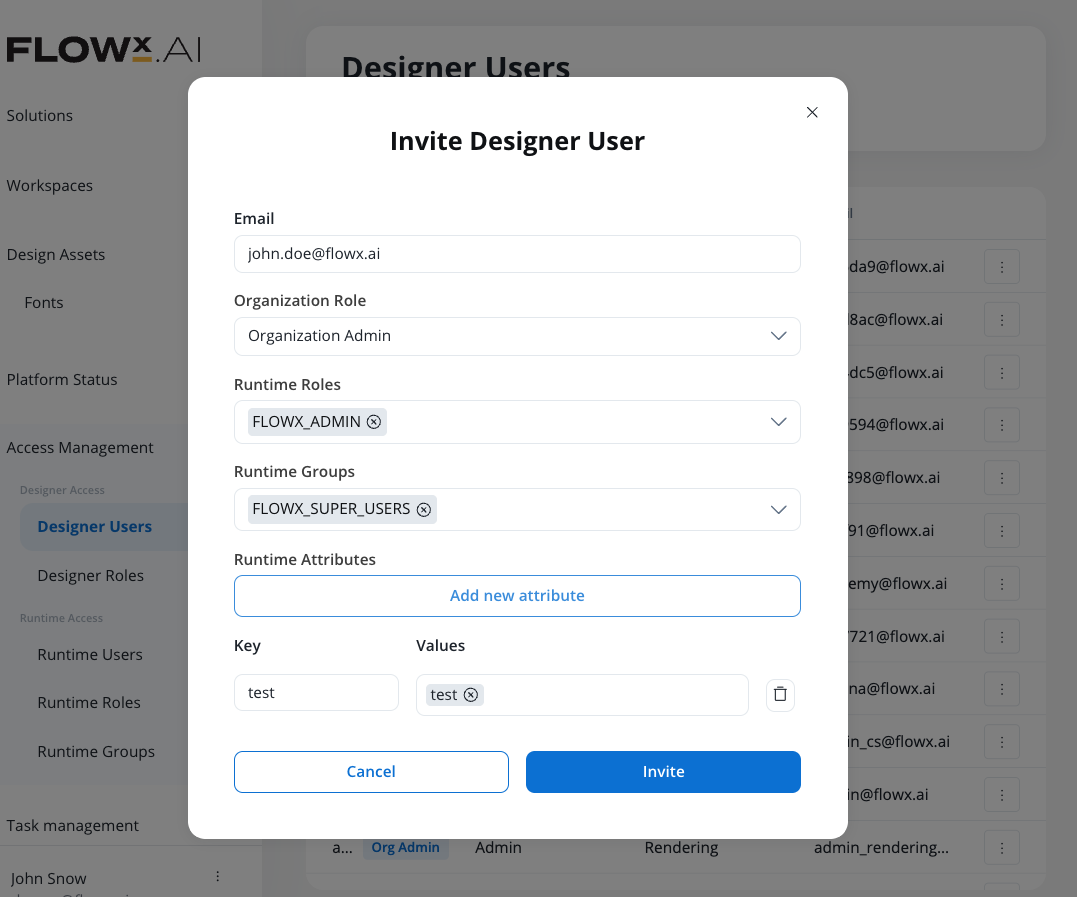 The invited user receives an email with the following content:Subject: You’ve been invited to your FlowX.ai accountHi,You’ve been invited to join the FlowX Platform to test our new Agentic Apps.This early access will let you explore how Agentic Apps work and give feedback on the experience before the broader rollout.[Accept Invitation]Best